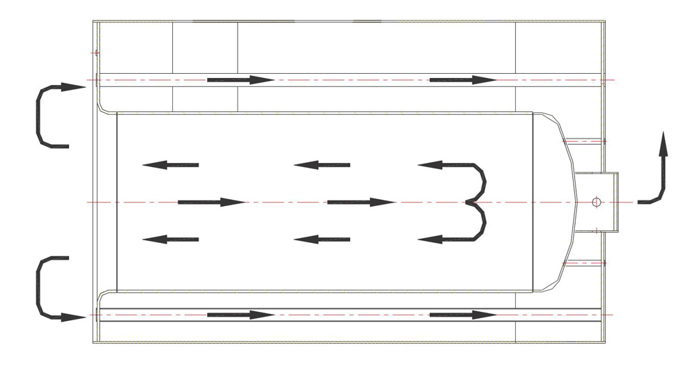 中心国燃结构:燃料自燃烧器向前喷入炉胆,在炉胆内正压燃烧;由于高速火熔引起烟气在炉胆中回流(卷)作用,高温烟气在从炉照尾部返回到前烟箱,再进入烟管进行充分换热,最后经烟自排入大气。结构充分利用炉腔辐射换热量和温度的4次方成正比的原理,炉胆设计宽大,有效辐射受热面大,辐射吸热量增大,强化了传热效果,提高锅炉热效率。